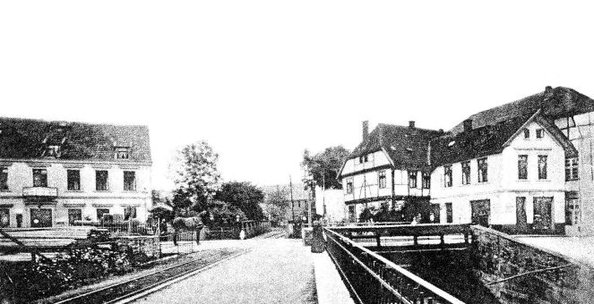 | Bild der Kleinbahnhaltestelle Weserstraße um 1905. Links, Gasthaus zur Post, wo von 1856 bis 1881 auch das Postamt untergebracht war. Rechts, die Gebäude des Schneidermeister Franz Finkhäuser.