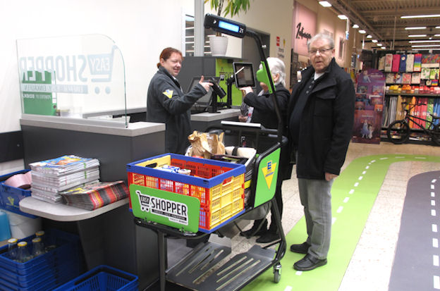 Waren einscannen, in den Einkaufswagen legen und bezahlen.