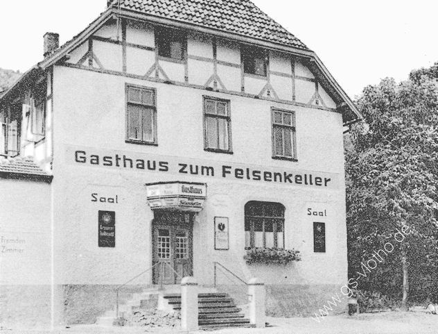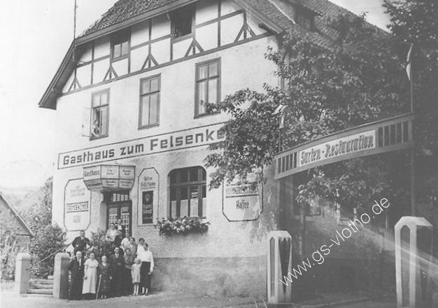 Gasthaus zum Felsenkeller. Mit auf dem Bild sind Urlaubsgäste aus Berlin, die im August 1937 ihre Ferien in Vlotho verbrachten und im Felsenkeller ihr Quartier bezogen hatten. Foto: 1937.