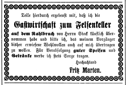 Die Gastwirtschaft Unter häufig wechselnden Besitzern wurde jedoch die Gastwirtschaft, zu der ein großer Garten mit der abschließenden offenen Kegelbahn gehörte, weiter betrieben. Neue Möglichkeiten bot der Saalanbau über dem großen Keller. Da er mit einer Bühne ausgestattet war, konnten auch Theatervorführungen veranstaltet werden. Auch die Vlothoer ,,Dramatische Vereinigung" führte am 6.3.1927 das Schauspiel „Kurt von Greifenklau" von A. Lücking auf. „Die reichlichen Pausen wurden mit Musik ausgefüllt, und damit war ein gewisser Ausgleich geschaffen“, heißt es in einem Zeitungsbericht. Es ist hier nicht der Raum, die vielen Veranstaltungen mannigfacher Art, die seit 1907 unter den Besitzern Friedrich Marten (später übernahm sein Sohn Rudolf den Felsenkeller) im „Felsenkeller" stattfanden, aufzuzählen. Von 1924 - 1931 fand die Jugendherberge, die von 1922 ab auf dem Boden der Realschule eine notdürftige Bleibe gehabt hatte, hier eine Unterkunft. Unfreiwillige Gäste waren die im Kriege hier untergebrachten Gefangenen. Das 1954 gegründete Kino „Capitol" fiel nach 10 Jahren dem großen Kinosterben zum Opfer. 1969 wurde nach genau 150 jährigem Bestehen auch der Betrieb der Gastwirtschaft eingestellt. Letzter Gastwirt war Toni Walter Geisler