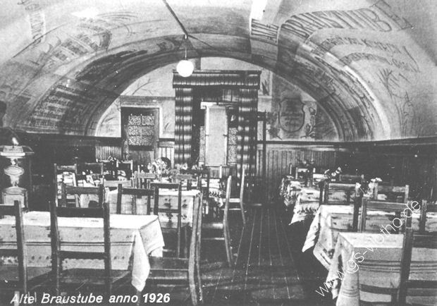 Alte Braustube. Die alte Braustube mit ihrem Bruchsteingewölbe lag direkt unter dem großen Saal und reichte fast bis zum Berghang. Foto: 1926.