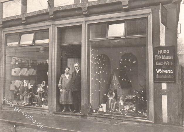 Rosa Therese und Hugo Finkhäuser vor ihrem Geschäft für Kurz-, Weiß- und Wollwaren. Gut zu erkennen sind die Schaufensterauslagen der damaligen Zeit.