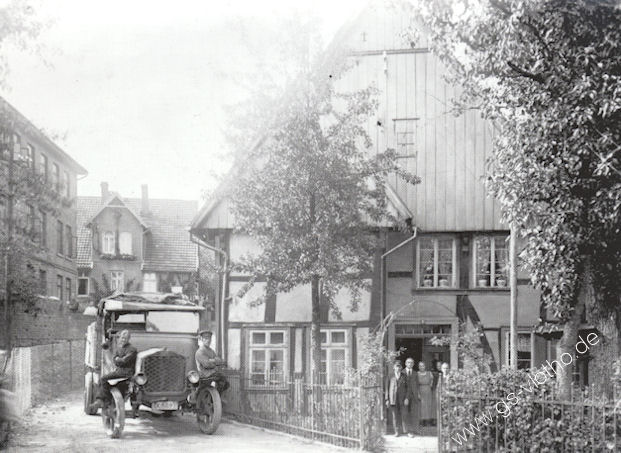 Das Foto zeigt rechts das Fachwerkhaus von Heinrich Köster mit seiner Familie und Kunden. Auf der linken Seite ist die Zigarrenfabrik Saatmann & Bödecker zu sehen. Das Haus in der Mitte ist die Gärtnerei Otto Scharfschwert, die später den Namen Gärtnerei Wolff trägt. Zum Lastwagen konnte ich keine Informationen bekommen. Foto: um 1925.