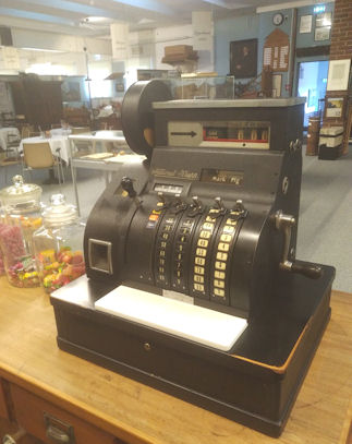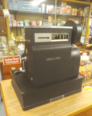 Diese Registrierkasse stand jahrelang bis Okt. 2023 bei Ulrich Köster auf dem Schelland. Als Vereinsmitglied (Heimatverein) und begeisterter Sammler sorgte Moritz Schürmann dafür, dass diese Kasse Baujahr 1939 nachgründlicher Überholung ins Heimatmuseum kam. Die Maschine druckt nun wieder Vlotho-Kassenbons und steht seit Ende 2023 auf der Ladentheke im Heimatmuseum.