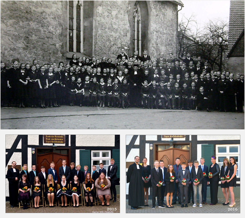 | Konfirmationsbilder: Beim großen Bild handelt es sich um die Konfirmanden/innen eines Jahrgangs am Anfang der 1950er Jahre. In der Mitte Pastor Oberhaus. – Auch die Farbfotos zeigen alle Konfirmanden/innen eines Jahrgangs (2015+2016) mit Pfarrer Stefan Föste. Wer sich auf dem sw-Foto erkennt, sollte sich unbedingt melden, damit das Foto genau datiert wird.