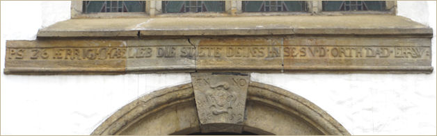 Wappen hängt über der kleinen Tür an der Südseite der Kirche.