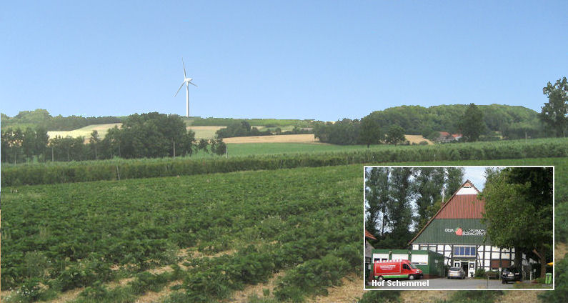 Der Solterberg von der Südseite. Im Vordergrund sind die Erdbeerfelder des Hofes Schemmel. Sie gehören bereits zur Stadt Bad Salzuflen (Kreis Lippe). Foto: 2010.