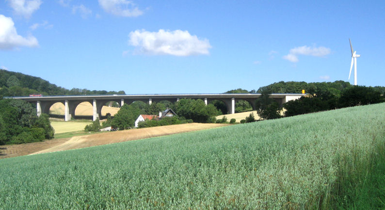 Autobahn Talbrücke Steinegge mit einer Länge von 255 Metern. Unterhalb der Brücke ist die Landwirtschaft des Hofes Koch. Als Blickfang der Steinegge präsentiert sich das Windrad. Foto: 2010.
