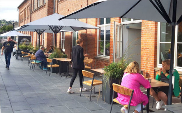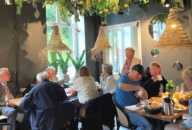 Einige Gäste haben es sich trotz des kühlen Sommertages am frühen Morgen auf der Terrasse gemütlich gemacht. Diese bietet Platz für bis zu 40 Gäste. 2. August 2023