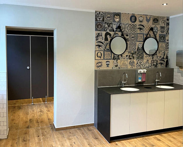 Nicht zu vergessen, denn das ist wichtig: Eine saubere Toilette will schließlich jeder haben und die findet man hier. Abgebildet ist der Damen-Waschraum und der Durchgang, der zu den einzelnen Toiletten führt. Die Herren-Toilette ist auf der entgegengesetzten Seite und bietet das gleiche Bild. Der Zugang ist im Flur und führt über die Treppe, so wie man es von dem historischen Bahnhof kannte. Neu ist der der Weg für Behinderte, sie gelangen mit dem Aufzug dorthin. – 2. August 2023