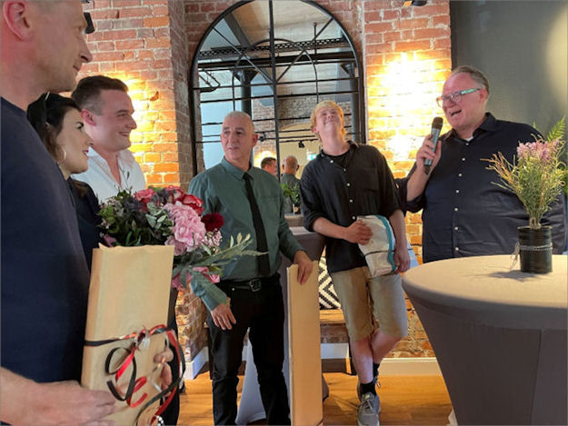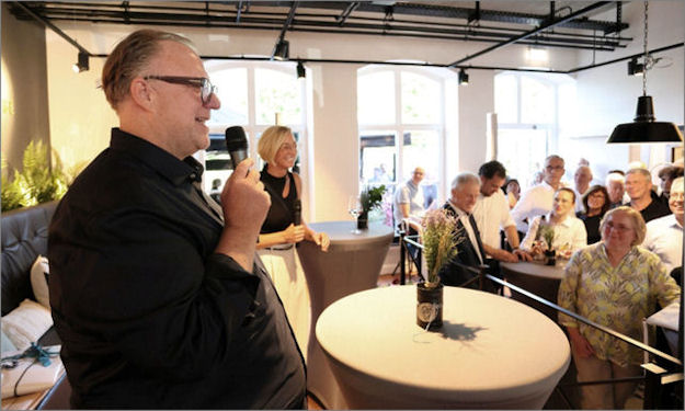 Am 11.08.23 konnten die Geschwister Karsten Krüger und Simone Böhne zahlreiche Ehrengäste begrüßen, die zur feierlichen Eröffnung des sanierten Bahnhofes gekommen waren. Landrat Jürgen Müller, Bürgermeister Rocco Wilken, die Landtagsabgeordneten Stefan Schwarze und Christian Dahm, sowie Ratsmitglieder und Vertreter der örtlichen Wirtschaft und Vereine waren der Einladung gefolgt. Der Unternehmer Karsten Krüger und seine Schwester Simone Böhne begrüßten mit lockeren Worten die zahlreichen Gratulanten. Nach dreijähriger Bauzeit präsentiert sich der Vlothoer Bahnhof heute in neuem Glanz. Viele Schwierigkeiten mussten überwunden werden, um dieses Mammut-Projekt erfolgreich zu sanieren. Die meiste Bausubstanz war marode, das Dach eingestürzt und die Decken nicht mehr tragfähig. Stück für Stück musste behutsam saniert werden, um die Auflagen des Denkmalschutzes zu erfüllen. Besonderen Dank erhielten der Architekt Henner Wolf, der Bauleiter Arne von Rabenau, die kompetenten Handwerker und alle beteiligten Behörden. Sie erhielten, ebenso wie einige Führungskräfte von Karlchen's Backstube, Blumensträuße oder andere Präsente.