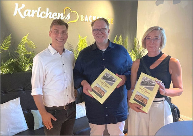 Bürgermeister Rocco Wilken überbrachte die Glückwünsche der Stadt Vlotho und übergab einen unvollständigen Bildband des Stadtchronisten Günter Schölzel. Beinahe täglich hat er den Baufortschritt im Bild festgehalten und die Geschichte des Bahnhofes von 1875 bis heute recherchiert. Ergänzt um die Fotos der heutigen Feierstunde liegt jetzt die endgültige Fassung des umfangreichen Buches vor. Das Buch wird nicht im Buchhandel erhältlich sein, sondern von der Stadtverwaltung an verdiente Bürger verschenkt werden. Im Anschluss an die Festreden konnten sich die Ehrengäste an einem üppigen Büfett erfreuen. Besonders gut schmeckte der alkoholfreie Cappuccino! Simone Bohne und Karsten Krüger hatten ausdrücklich dazu aufgefordert, sich an diesem Festtag zu betrinken. Das konnten die Autofahrer allerdings nicht beherzigen! Viele Ehrengäste erkundeten anschließend die Räumlichkeiten, einschließlich des Kellergewölbes. Besonders interessant ist das Original-Urinal der alten Herrentoilette, welches jetzt im Vorraum der Damen-Toilette zu finden ist. Vom Keller kann man mit einem Lift zum Erdgeschoss fahren. Bei strahlendem Sommerwetter nahmen viele Gäste auf der Terrasse Platz, die einen Blick auf den Bahnsteig bietet. Die Besucher waren begeistert über die gelungene Sanierung des Vlothoer Bahnhofes. Schon im Jahre 1981 gab es allerdings Pläne, den Bahnhof abzureißen und durch einen Neubau zu ersetzen. „Die Bausubstanz ist derart marode, dass es mit Ausbesserungen nicht mehr getan wäre. Außerdem würden gerade die wahnsinnig viel Geld kosten.“ (Dieter Lehmann von der DB) So stand es im Herforder Kreisblatt am 29.01.1981. Wie gut, dass diese Pläne nie umgesetzt wurden! Und das Geschwisterpaar Krüger / Böhne den Mut hatte, die Bauruine zu sanieren! Der liebevoll umgestaltete Bahnhof ist ein Vorzeigeprojekt für unsere Stadt und wird als „Begegnungsstätte“ viele Generationen erfreuen! Schon in der ersten Woche haben sich mehrere Stammtische angemeldet, die die schöne Lokalität dauerhaft nutzen wollen. Wir wünschen dem Team von Karlchen's Backstube einen andauernden Geschäftserfolg!