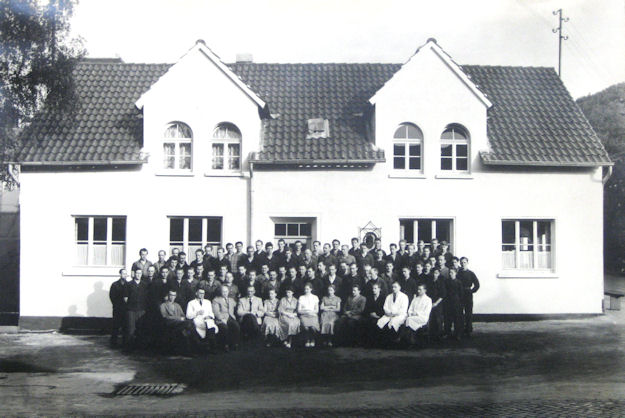 Das Verwaltungsgebäude an der Herforder Straße Nr. 89. Mit auf dem Bild, die damalige Belegschaft (ca.80 Leute). Foto: 1954