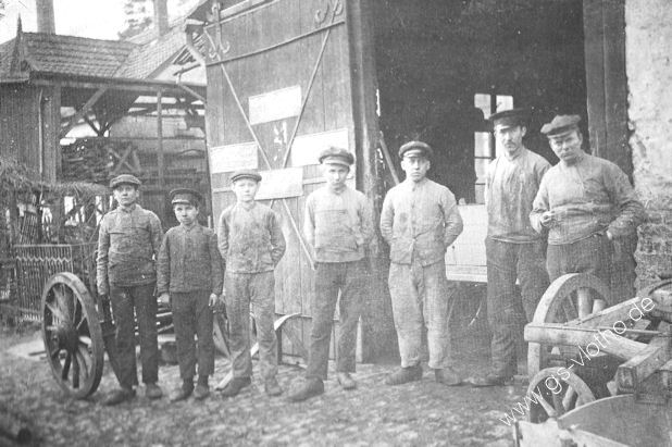 August Henke sen. (r) mit einen von drei Gesellen und fünf Lehrlinge. Foto: 1904.