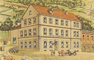 Jahr 1898. Sie zeigt das Gebäude des Hotels Schmidt aus Richtung des
