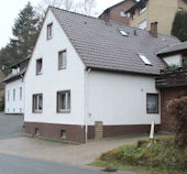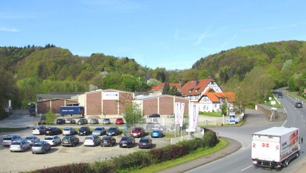 Der heutige Standort in Vlotho (Ansicht aus Richtung Norden) an der Herforder Straße Nr. 99. Als Schmuckstück im Vordergrund die beiden Fachwerkhäuser. Foto: 2012.