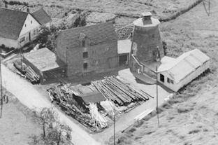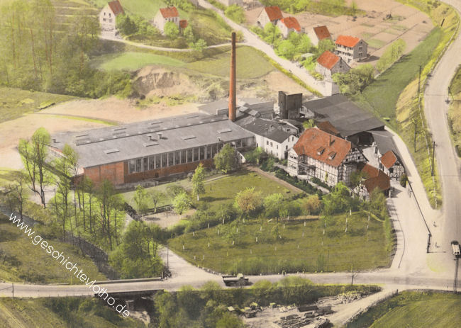 Ein Luftfoto, das im Besitz der Familie G. von Deylen ist, zeigt die ehemalige Papierfabrik (Ansicht aus NO) . Die große Grünfläche, die damals zum Teil noch ein Garten war, wurde inzwischen durch zwei moderne Werkshallen von der Firma Fritz Lohmeier bebaut. Wo sich heute der Marktkauf befindet, war zu jener Zeit ein freies Feld. Foto: 1959.